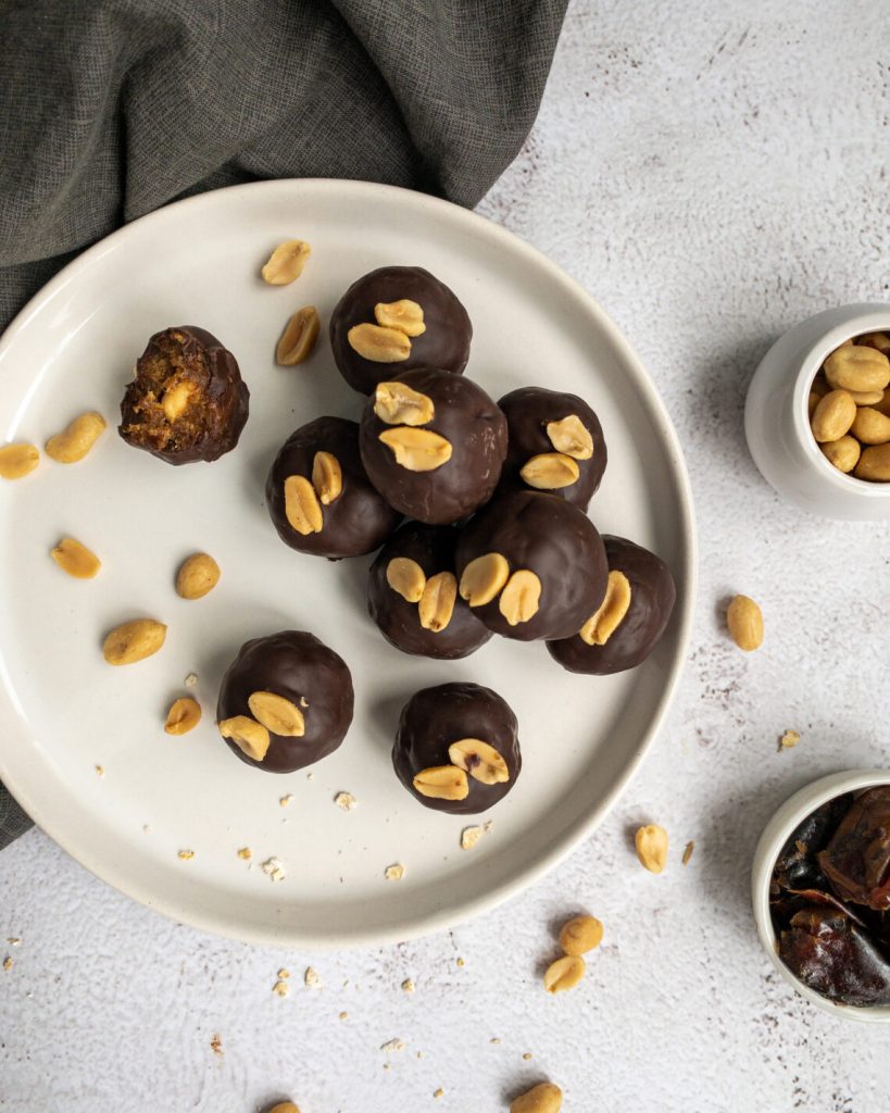 Intre timp, vom topi ciocolata pe baie de aburi sau la microunde. Trecem fiecare bomboana prin ciocolata cu ajutorul unei furculite si le asezam pe o foaie de hartie, avand grija sa scurgem surplusul de ciocolata. Apoi, asez cateva arahide deasupra si le dau la frigider pana se intareste ciocolata complet.