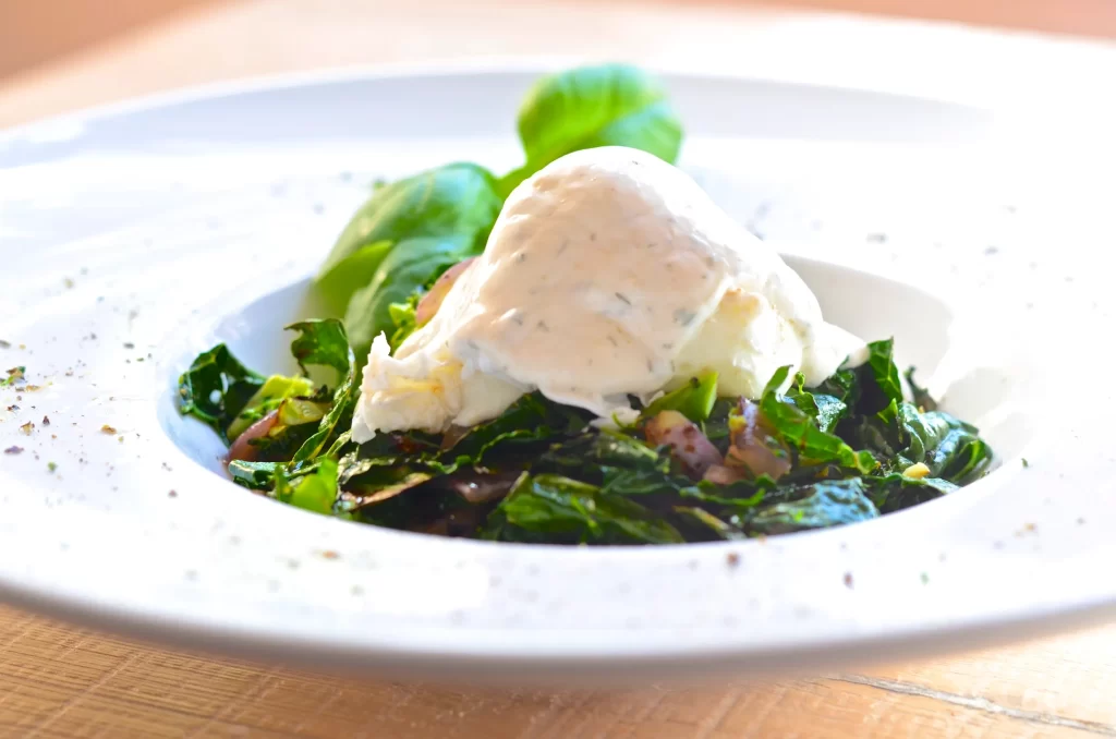 Într-un bol zdrobeste avocado și amesteca-l cu usturoiul, fulgii de chilli, sarea si piperul.Pentru a-ți aranja bowl-ul, aseaza frunzele la baza, apoi mixtura de avocado si la final ouale posate