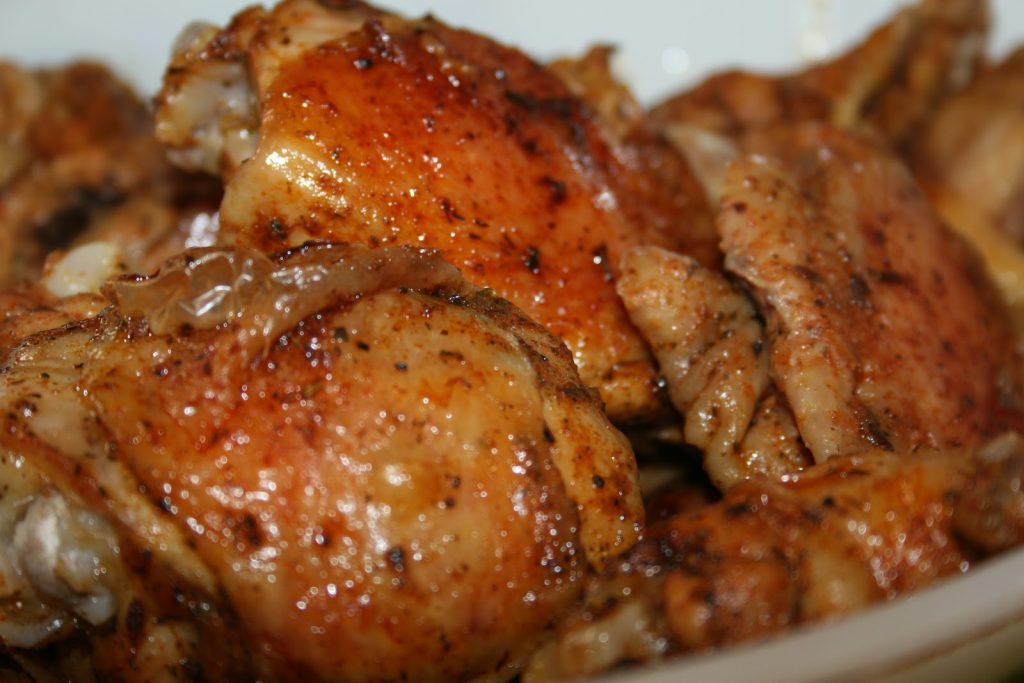 Morcovii , ardeii , usturoiul se presară deasupra cartofilor, peste legume se așează pulpele de pui , se condimentează , se adaugă ulei , apă , se introduc la cuptor pană cand a scăzut toată apă
